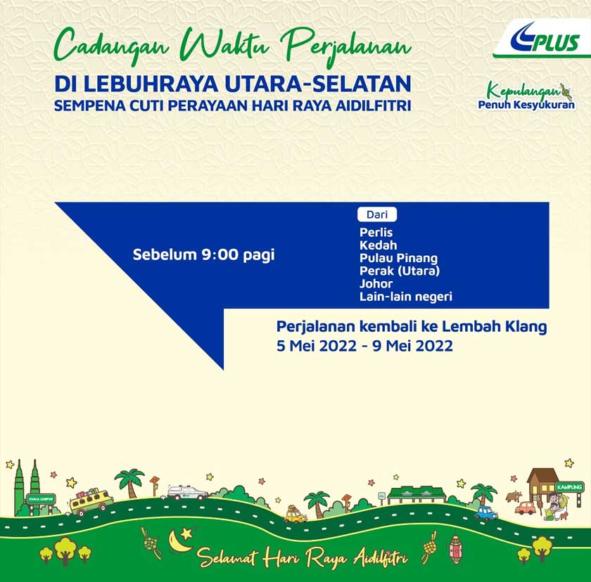 Jika anda memandu pulang ke bandar selepas cuti Raya anda, tempoh tol percuma seterusnya ialah dari 12:01 pagi (Sabtu) 7 Mei hingga 11:59 malam (Ahad) 8 Mei. Menurut PLUS, penepian tol dikira apabila keluar dari lebuh raya.