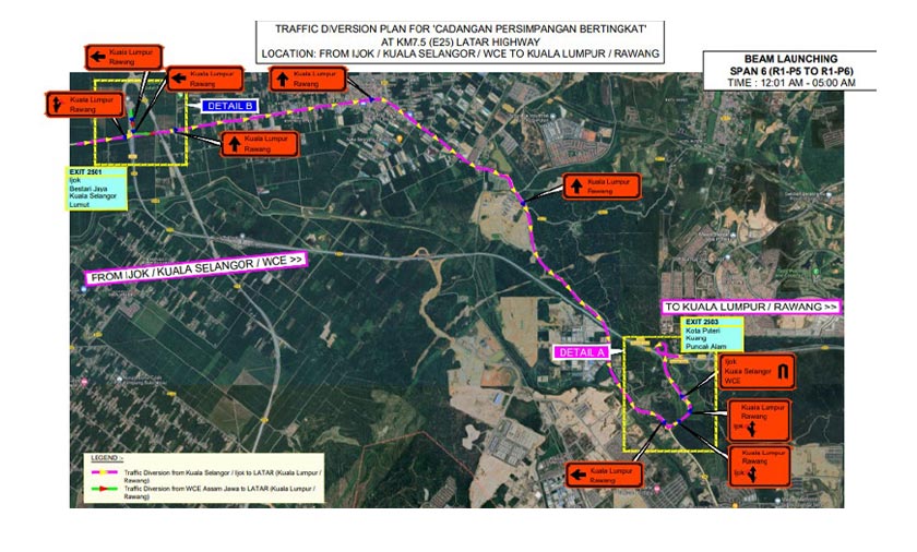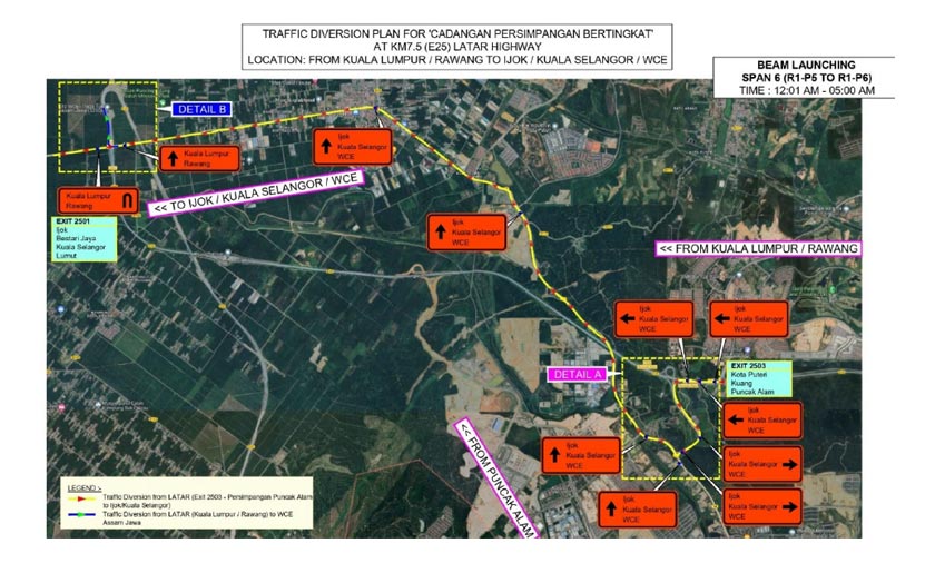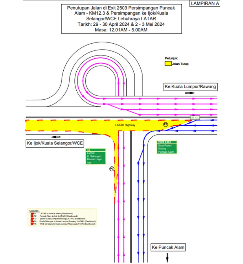 Sepanjang penutupan itu, trafik dari arah Kuala Lumpur/Rawang/LATAR akan dilencongkan ke Jalan Kuala Selangor melalui Persimpangan Puncak Alam untuk ke Ijok/Kuala Selangor/Lebuhraya Pesisiran Pantai Barat (WCE) manakala trafik dari arah Puncak Alam menghala ke Ijok/Kuala Selangor/WCE (LATAR) dilencongkan ke Jalan Kuala Selangor.