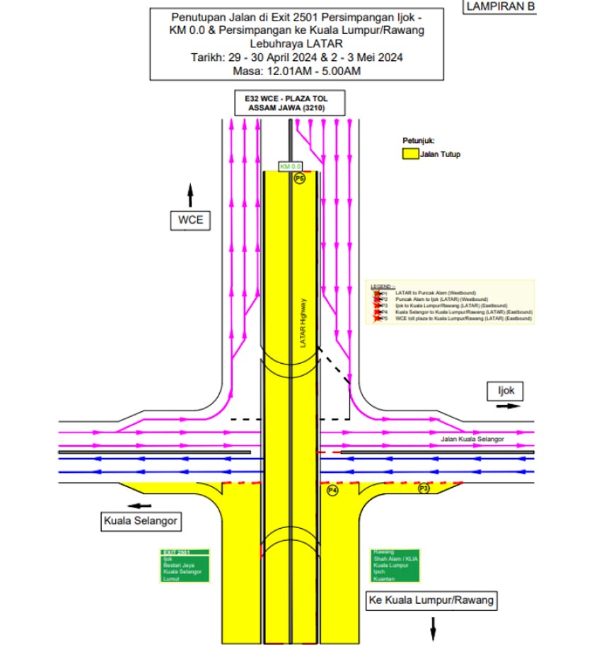 "Trafik dari arah Ijok/Kuala Selangor/WCE (LATAR) pula akan dilencongkan ke Jalan Kuala Selangor untuk ke Kuala Lumpur/Rawang dan papan tanda arah sementara akan ditempatkan di lokasi terbabit bagi memberi panduan kepada pengguna," menurut kenyataan itu.