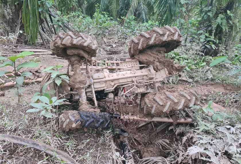 Malang tidak berbau, seorang pekerja ladang maut apabila traktor dipandunya terbalik sebelum menghempap badannya dalam kejadian di Kampung Luagan, di sini, pada Rabu.