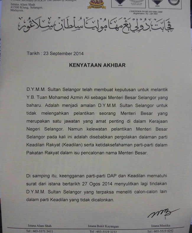 Di samping itu keengganan parti-parti DAP dan Keadilan mematuhi surat daripada istana bertarikh 27 Ogos 2014 menyulitkan lagi tindakan D.Y.M.M Sultan Selangor yang terpaksa meneliti calon-calon lain dalam parti Keadilan yang tidak dicalonkan," katanya dalam satu kenyataan di sini hari ini.