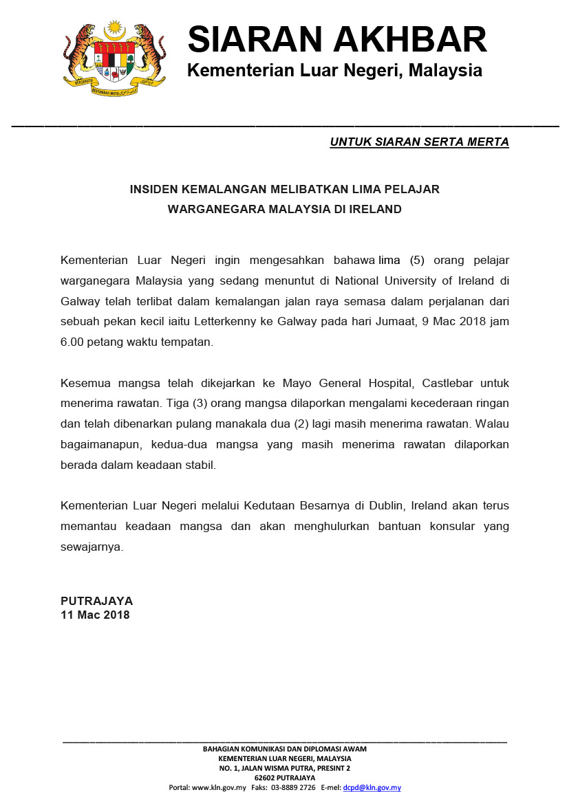 Kementerian Luar mengesahkan lima penuntut Malaysia yang sedang belajar di National University of Ireland di Galway terlibat dalam kemalangan jalan raya pada Jumaat (9 Mac) lepas ketika sedang menuju ke Galway dari sebuah pekan kecil iaitu di Letterkenny.