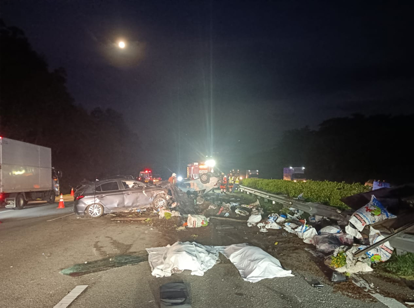 “Kemalangan membabitkan lori membawa muatan tanah dan bunga dinaiki tiga individu, kereta jenis Honda City, kereta jenis BMW, dan sebuah lagi kereta jenis Toyota Vios dipandu seorang lelaki warga Myanmar.