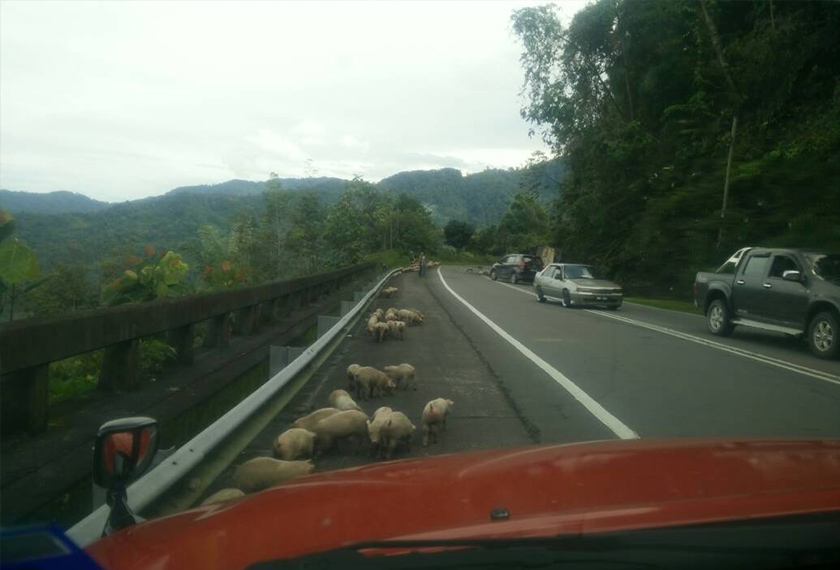 Beberapa pengguna jalan raya di Kilometer 31 Jalan Moyog Penampang-Tambunan, dekat sini, terkejut apabila melihat sekawan anak babi berkeliaran di atas jalan raya, pagi tadi.