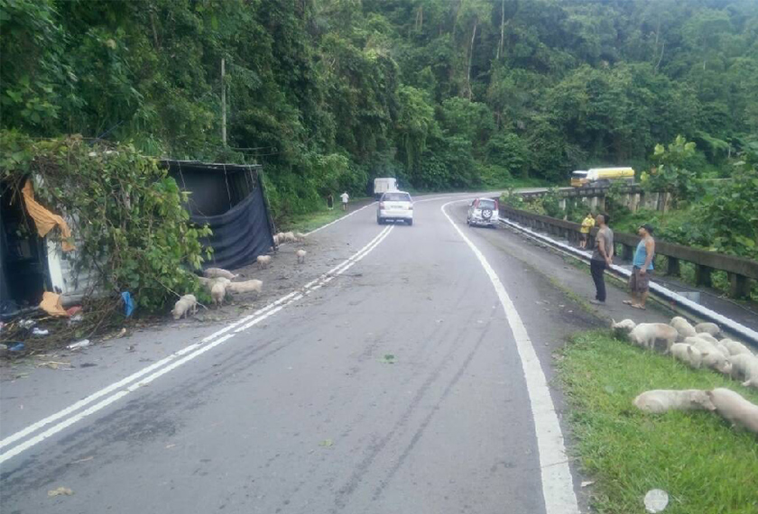 Kejadian kira-kira jam 8.40 pagi itu berlaku selepas lori yang membawa muatan 200 ekor anak babi itu terbalik di bahu jalan selepas terbabas di satu selekoh.