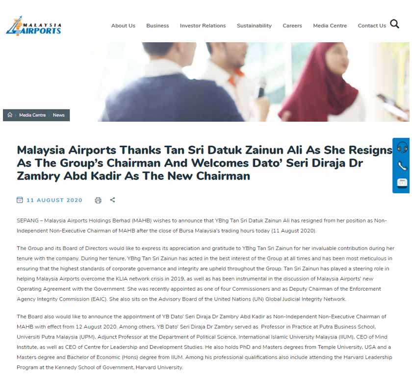 “Tan Sri Zainun telah memainkan peranan dalam membantu Malaysia Airports mengatasi krisis rangkaian KLIA pada 2019 dan juga berperanan dalam perbincangan Perjanjian Pengoperasian Baharu Malaysia Airports dengan kerajaan,” kata kenyataan tersebut.