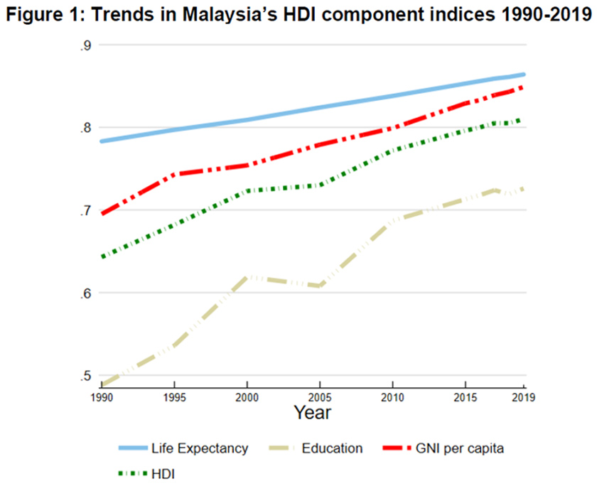 Antara tahun 1990 hingga 2019, nilai HDI Malaysia meningkat sebanyak 26 peratus iaitu daripada 0.64 kepada 0.81.