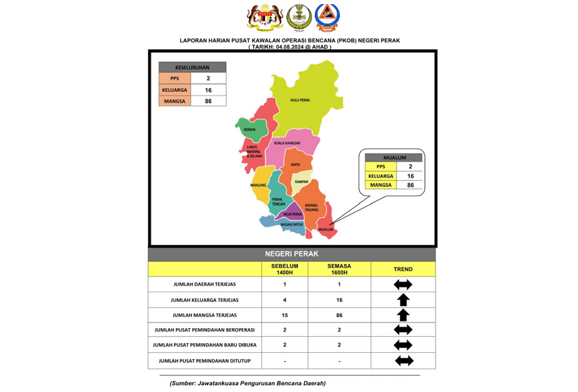 Menurut jurucakap Pusat Kawalan Operasi Bencana (PKOB) Negeri Perak, kesemua mangsa kekal ditempatkan di dua pusat pemindahan sementara (PPS).