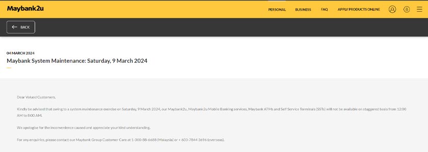 MAYBANK memaklumkan bahawa gangguan perkhidmatan akan berlaku pada 9 Mac 2024 (Sabtu).