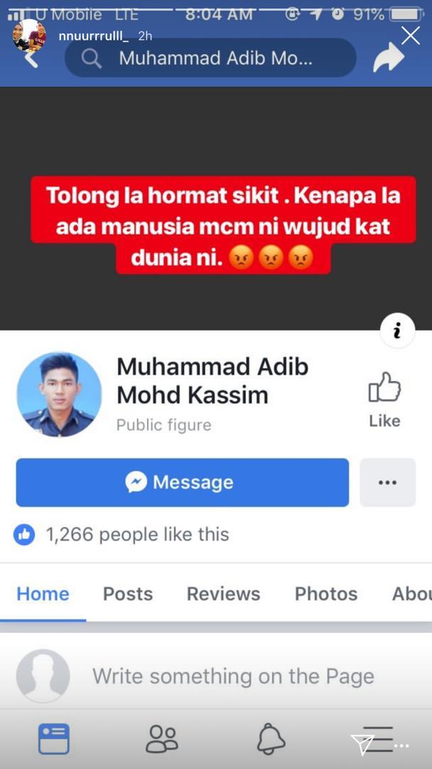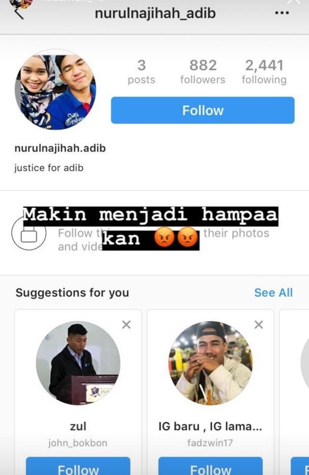 NURUL NAJIHAH RADZI, tunang kepada aggota bomba Allahyarham Muhammad Adib Mohd Kassim, 24, yang meninggal dunia akibat parah dibelasah dalam kejadian rusuhan di Kuil Sri Maha Mariamman, USJ25, Subang Jaya, 27 November lalu, kecewa apabila wujudnya banyak akaun palsu dirinya di laman sosial.