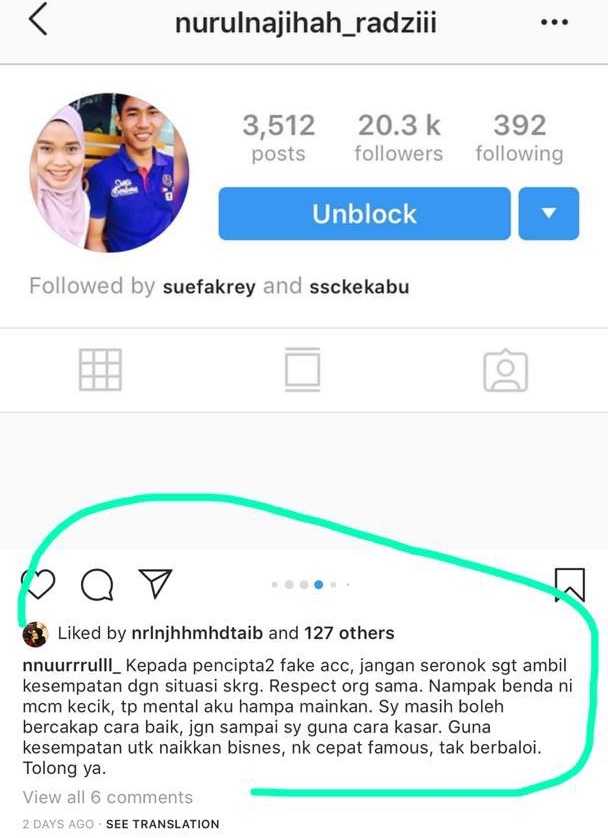 Najihah berharap pencipta akaun palsu itu boleh memberhentikan aktiviti terkeji mereka.