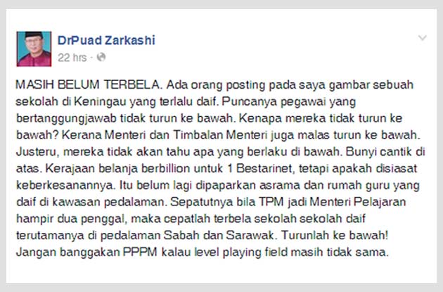 Catatan di laman Facebook Dr Mohd Puad yang mengatakan Menteri serta Timbalan Menteri Pendidikan malas menjadi punca ada sekolah yang masih daif di pedalaman - Sumber gambar Facebook