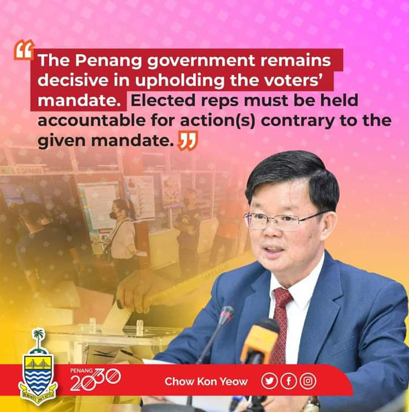 Kon Yeow berkata, kerajaan negeri tetap bertegas dalam mempertahankan mandat diberikan pengundi dan menegaskan wakil rakyat yang dipilih mestilah bertanggungjawab dengan tindakan yang bertentangan dengan mandat yang diberikan kepada mereka.