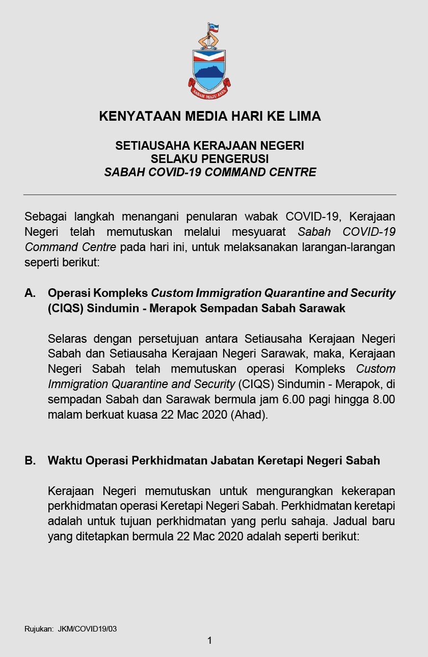 "Selaras dengan persetujuan antara Setiausaha Kerajaan Negeri Sabah dan Setiausaha Kerajaan Negeri Sarawak, maka kita telah memutuskan operasi (CIQS) Sindumin - Merapok, bermula jam 6 pagi hingga 8 malam berkuatkuasa hari ini," katanya.