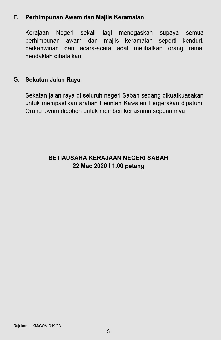 "Sekatan jalan raya di seluruh Sabah sedang dikuatkuasakan untuk memastikan arahan Perintah Kawalan Pergerakan dipatuhi," katanya.
