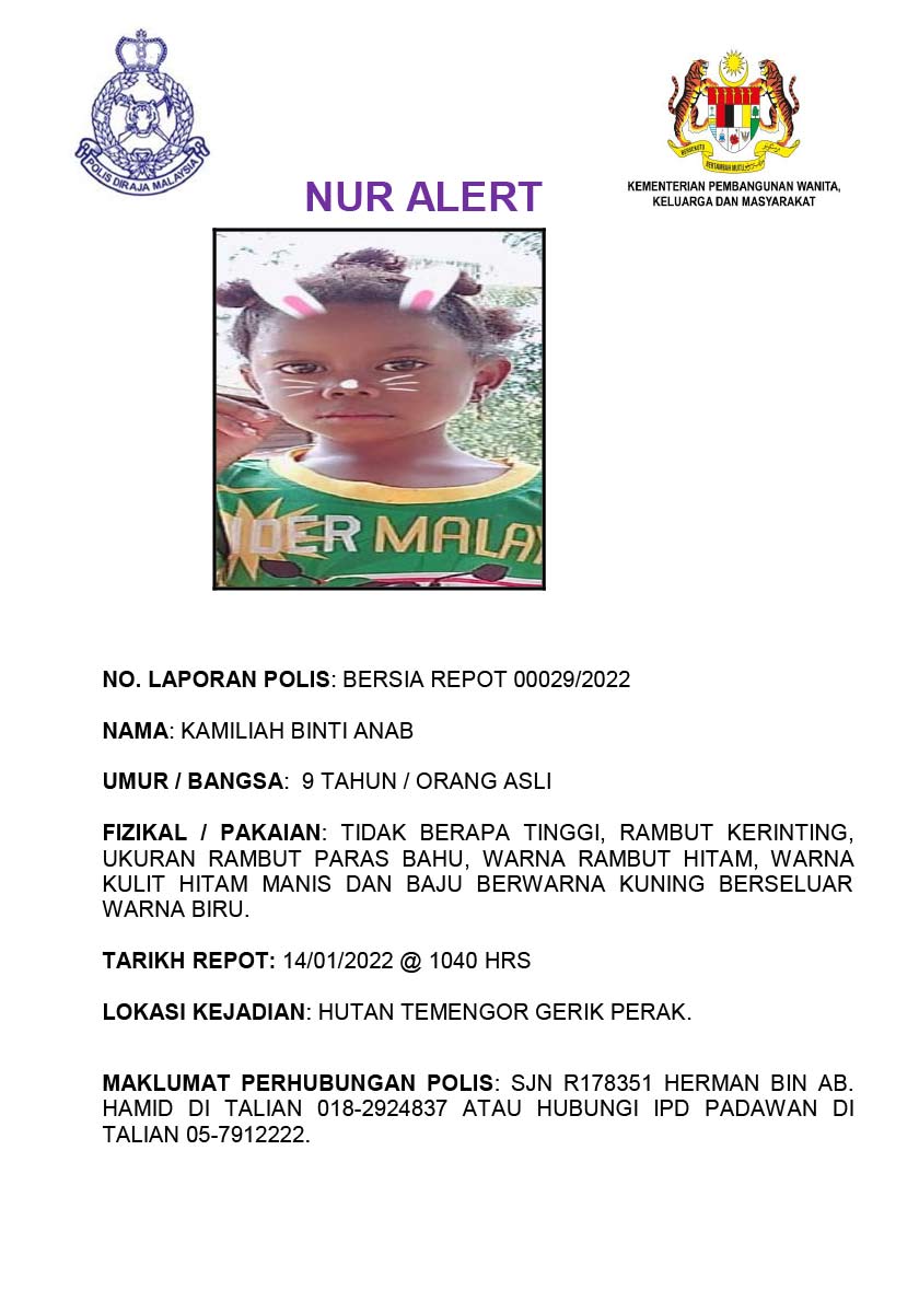 Kamiliah Anab, 9 tahun, disedari hilang sekitar jam 4.30 petang selepas keluarganya bersama penduduk lain pulang dari mencari hasil hutan di Kampung Selaur, berhampiran Padang Jeri, dekat sini.