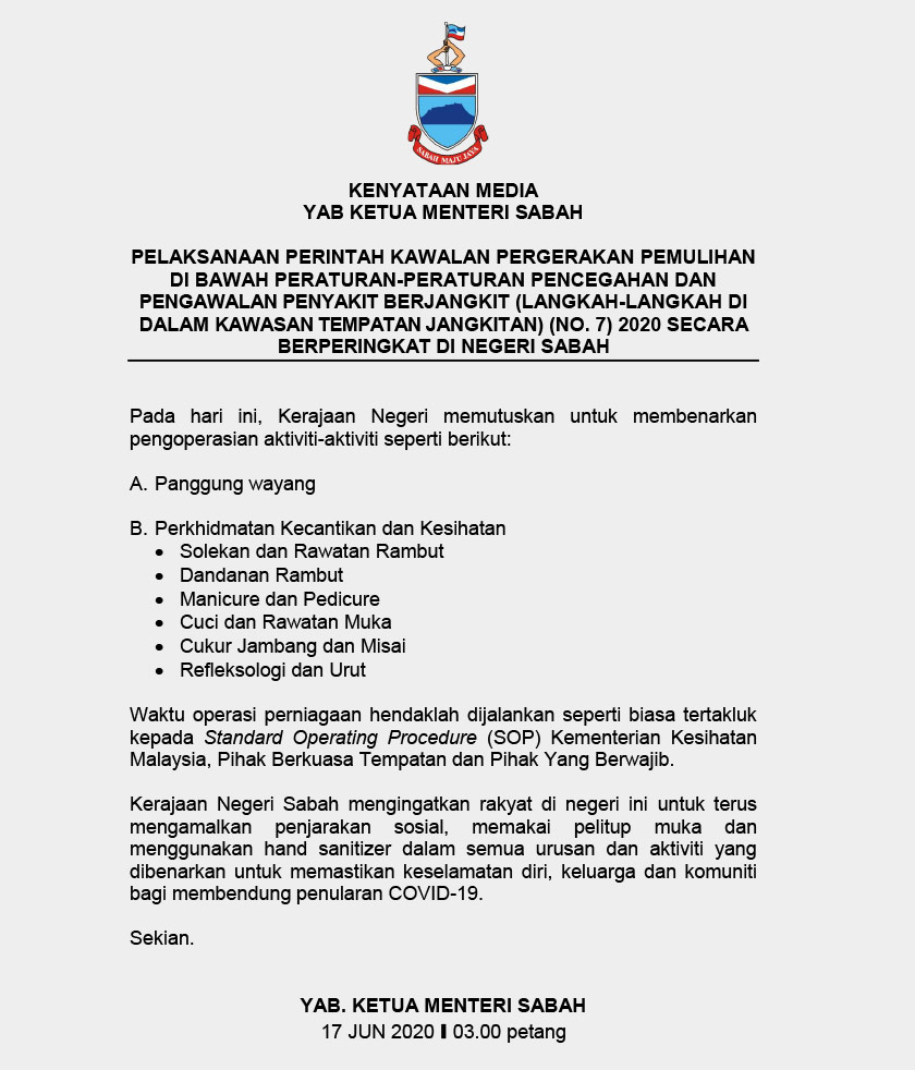 "Kerajaan negeri mengingatkan rakyat di Sabah untuk terus mengamalkan penjarakan sosial, memakai pelitup hidung dan mulut serta menggunakan cecair penyahkuman dalam semua urusan bagi memastikan keselamatan diri, keluarga dan komuniti bagi membendung penularan COVID-19.