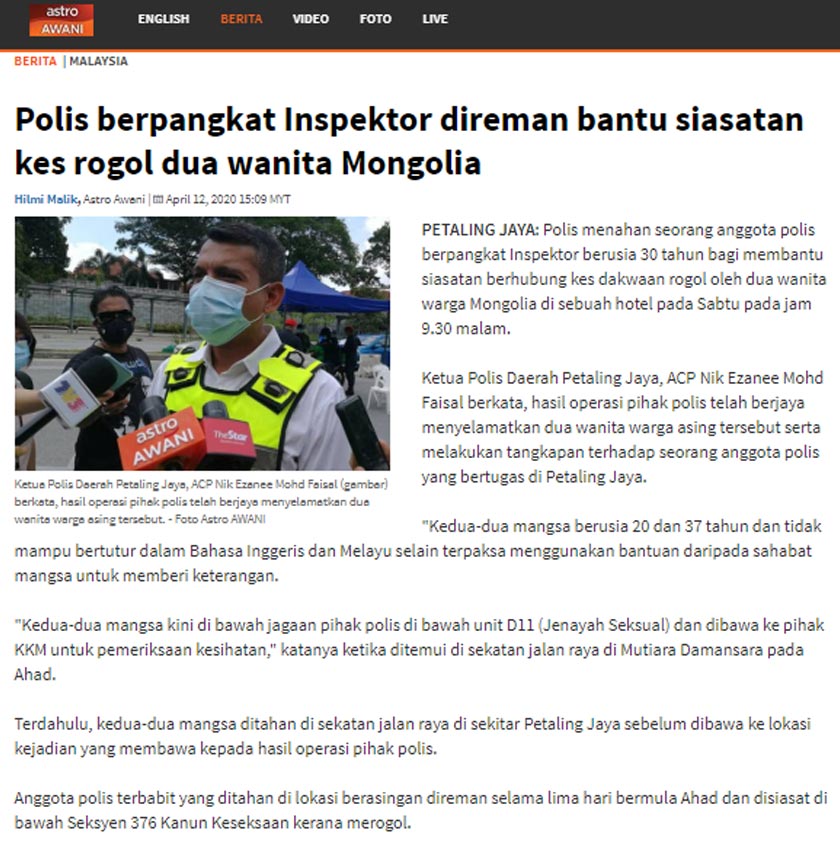 Sebelum ini, Ketua Polis Daerah Petaling Jaya, Asisten Komisioner Nik Ezanee Mohd Faisal mengesahkan, seorang pegawai polis berpangkat Inspektor dari Ibu Pejabat Polis Daerah (IPD) Petaling Jaya ditahan kerana disyaki merogol dua wanita Mongolia dalam kejadian di sebuah hotel dekat sini, Sabtu lalu.