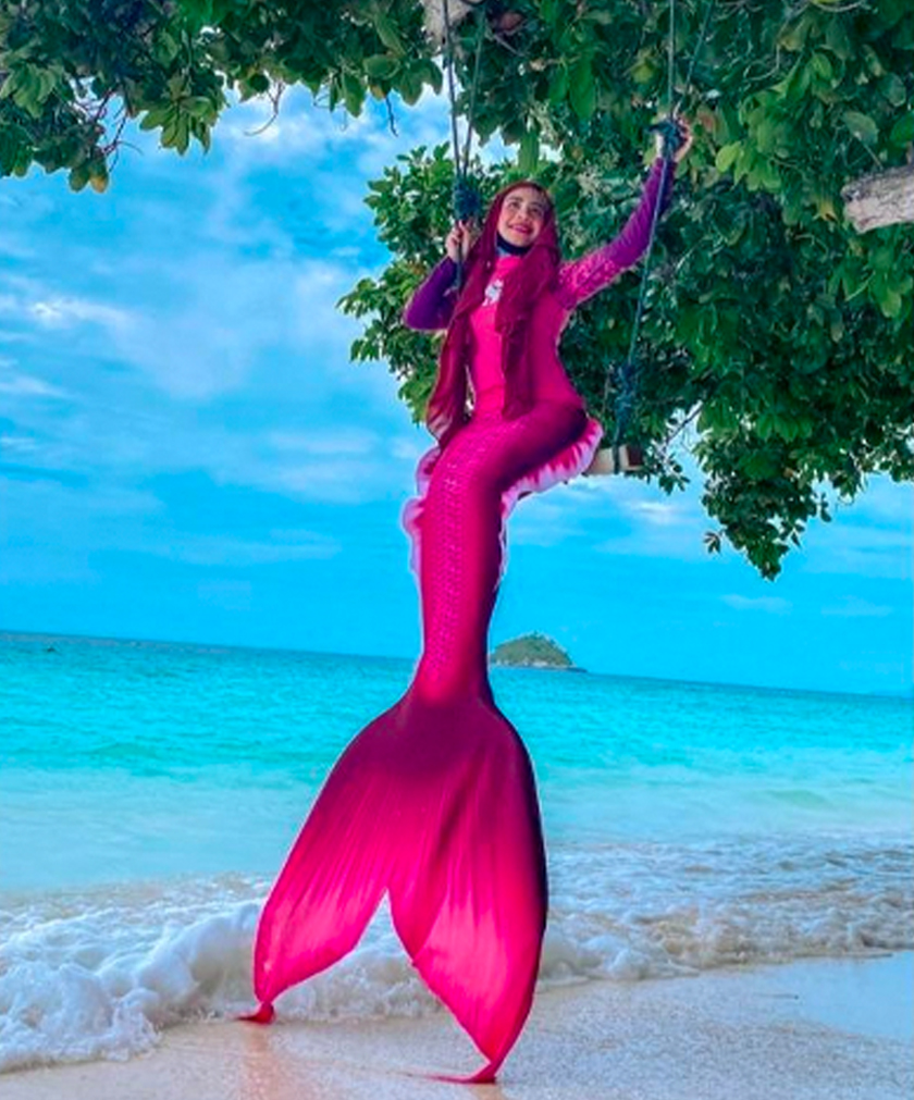 Namun, penampilan ikan duyung berusia 37 tahun itu sedikit berbeza dengan Ariel apabila kostum yang dikenakannya mengekalkan imej Muslimah.