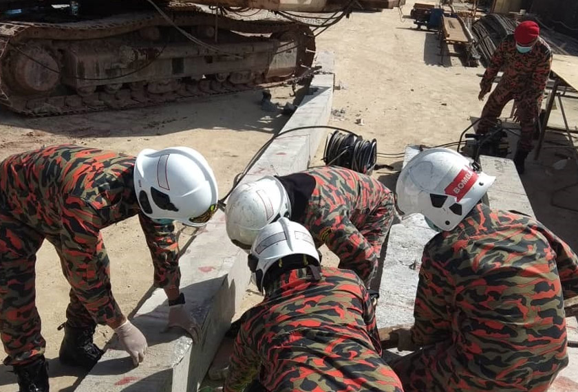 Manakala seorang lagi pekerja masih berada di bawah tiang cerucuk tersebut dan pihak bomba menggunakan peralatan khas untuk mengalihkan binaan konkrit itu bagi mengeluarkan mangsa yang tersepit di bawah tiang berkenaan.