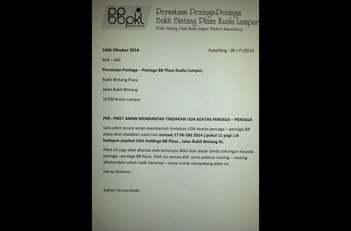 Surat makluman piket aman yang akan dilakukan peniaga di Plaza BB pada Jumaat - Gambar Astro AWANI