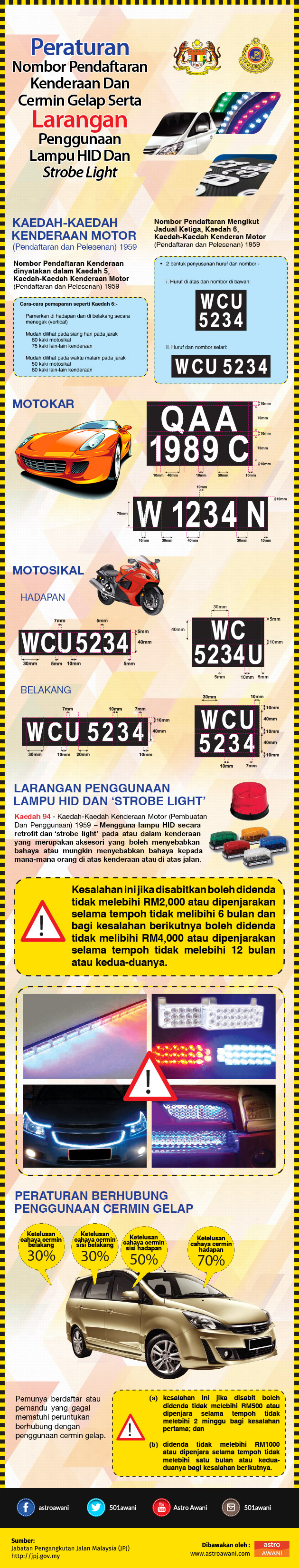 Sementara itu Jabatan Pengangkutan Jalan (JPJ) akan melaksanakan Operasi Khas terhada pemilik kenderaan yang menggunakan lampu ‘strobe’, lampu High-Intensity Discharge (HID) atau xenon dan saiz nombor pendaftaran tidak mengikut spesifikasi bermula 1 Nov depan.