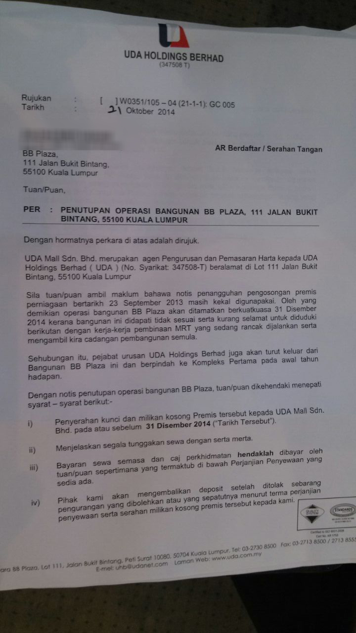 Notis UDA Holdings Bhd (UDA) kepada semua penyewa di Plaza Bukit Bintang (Plaza BB) untuk keluar sebelum akhir tahun ini benar-benar mengejutkan semua peniaga di situ.
