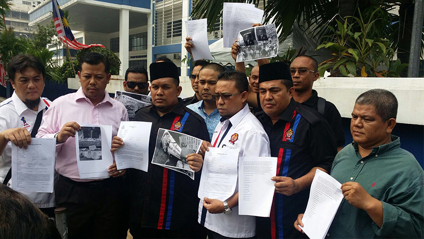 Armand dan Briged Kesatria Muda Pergerakan Pemuda UMNO membuat laporan mengenai peserta Bersih 4 yang memijak gambar pemimin di Balai Polis Dang Wangi - Sumber gambar Armand