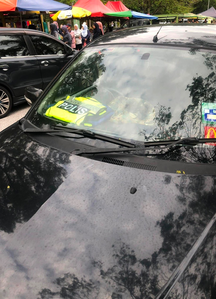 Dalam gambar berkenaan turut dipaparkan sehelai ‘vest’ yang tertulis perkataan ‘POLIS’ telah diletakkan pada papan pemuka kenderaan terbabit.
