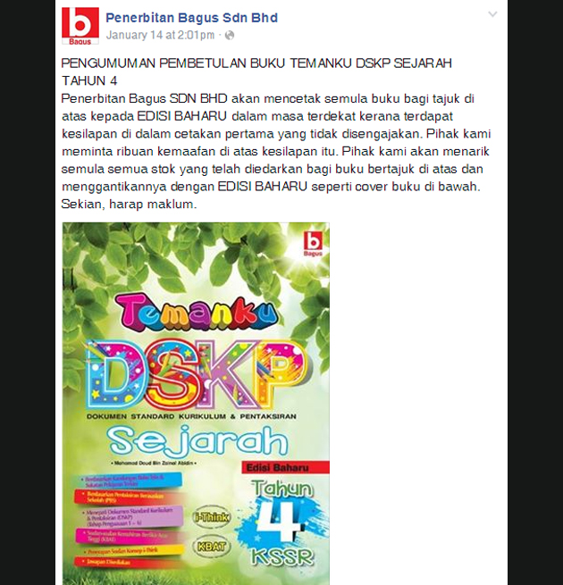 "Pihak kami meminta ribuan kemaafan di atas kesilapan itu. Pihak kami akan menarik semula semua stok yang telah diedarkan bagi buku bertajuk di atas dan menggantikannya dengan edisi baharu," kata wakil penerbitan itu di dalam catatan di laman Facebook mereka.