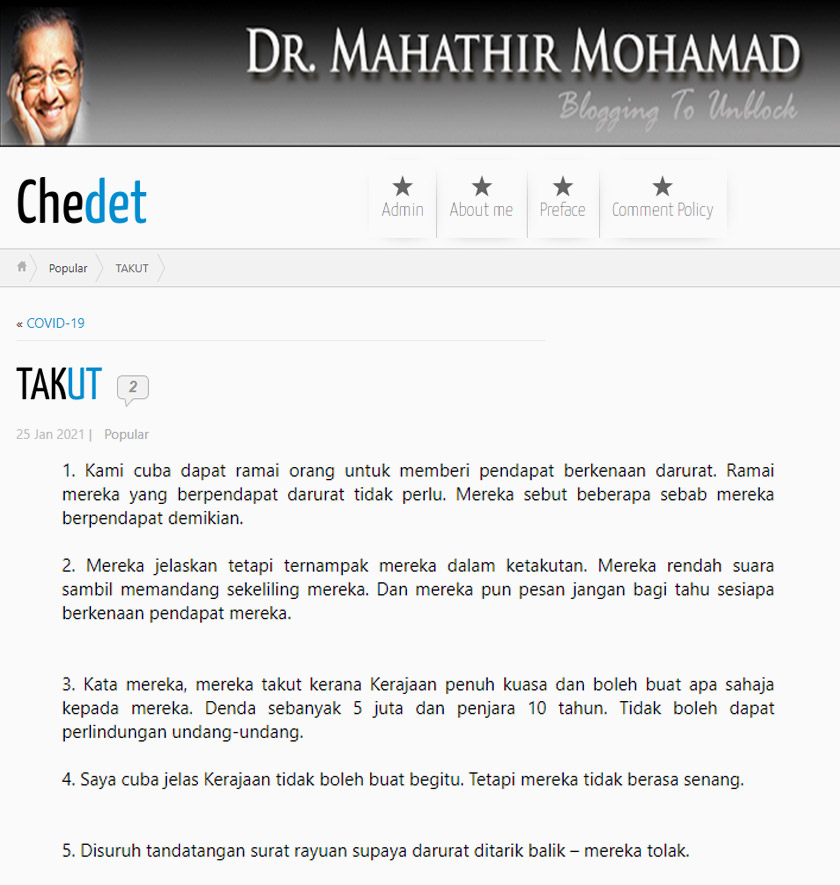 "Mereka takut kerana Kerajaan penuh kuasa dan boleh buat apa sahaja kepada mereka, denda sebanyak RM5 juta dan penjara 10 tahun serta tidak boleh dapat perlindungan undang-undang," tulis Dr Mahathir di blognya, chedet.cc, pada Isnin.
