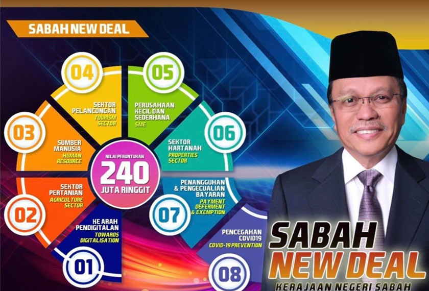 Kerajaan Sabah hari ini mengumumkan peruntukan Pakej Bantuan COVID-19 fasa kedua bertemakan 'Sabah New Deal' bernilai RM240 juta bagi membantu mengaktifkan, memulih dan menyuburkan kembali sektor ekonomi negeri yang terjejas berikutan pandemik virus itu.