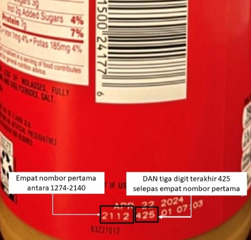 “Notis tersebut menyatakan bahawa Pihak Berkuasa Dadah dan Makanan, Amerika Syarikat (USFDA ) mengarahkan penarikan semula mentega kacang Jif yang dijangkiti Salmonella dengan nombor kumpulan 1274425 sehingga 21404425, dengan 425 di nombor digit terakhir 425, kerana telah tercemar dengan bakteria Salmonella.