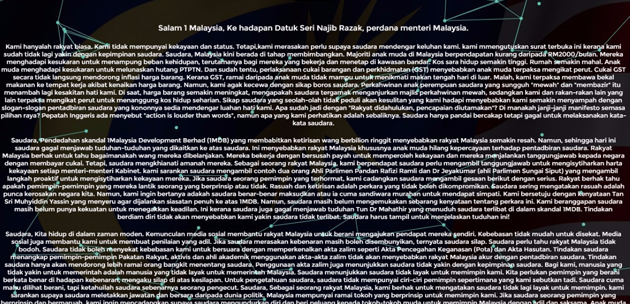 Satu surat layang yang ditujukan kepada perdana menteri turut terpapar dalam web tersebut.
