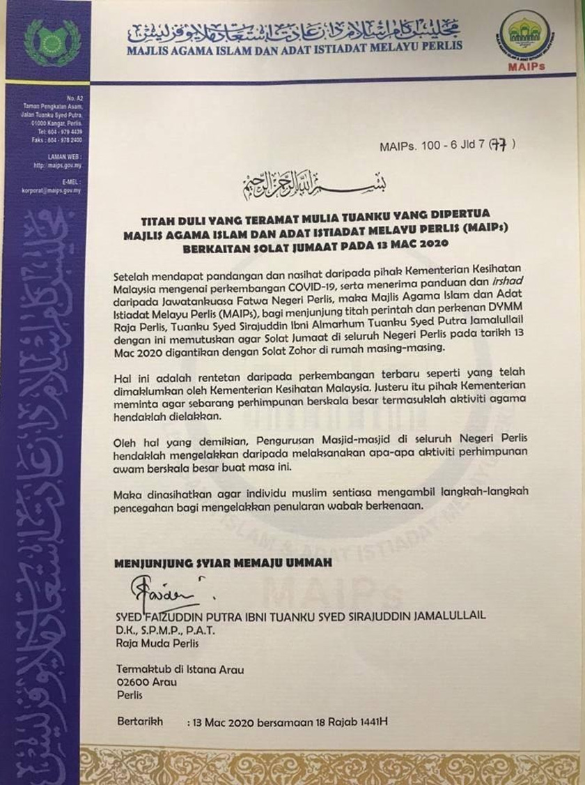 “Oleh yang demikian, pengurusan masjid-masjid di seluruh negeri Perlis hendaklah mengelakkan daripada melaksanakan apa-apa aktiviti perhimpunan awam berskala besar buat masa ini," tambahnya.