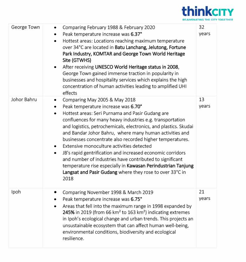 Selain Bayan Lepas dan George Town di Pulau Pinang, bandar raya lain yang tersenarai mengalami peningkatan suhu secara konsisten adalah Kuala Lumpur; Johor Bahru, Johor dan Ipoh, Perak.
