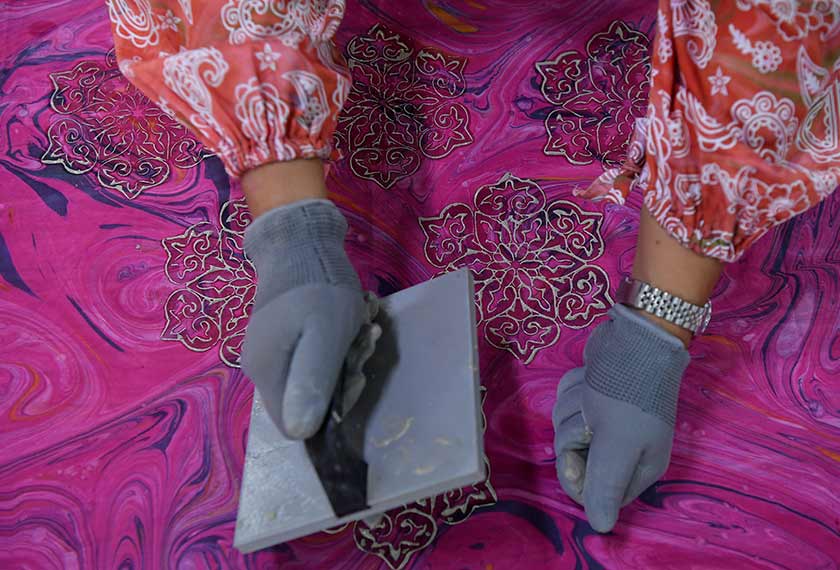 Norazizah Kasim, 43, berkata tanah liat lebih mudah didapati di pasaran, harganya lebih rendah dan proses penghasilan batik boleh dilakukan dalam suasana yang lebih selesa, tanpa perlu berdepan bahang api seperti teknik campuran lilin dan damar.