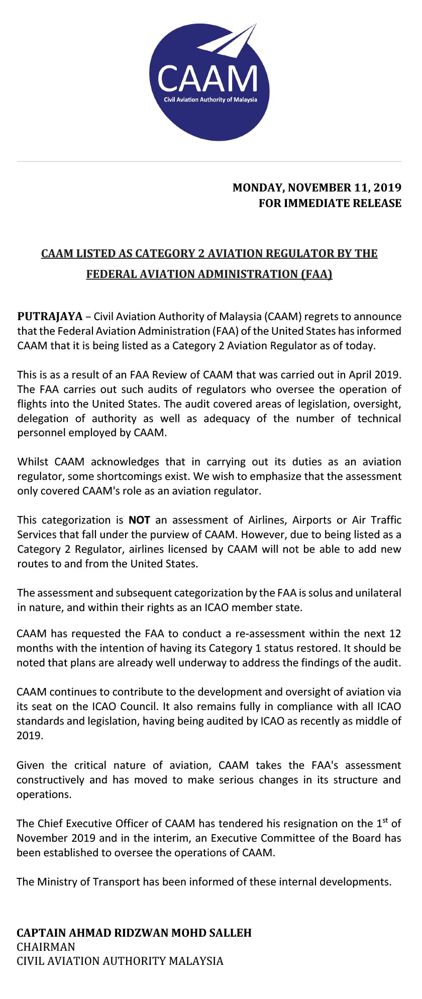 Sementara itu, Pengerusi Pihak Berkuasa Penerbangan Awam Malasia (Civil Aviation Authority Malaysia – CAAM) Kapt Ahmad Ridzwan Mohd Salleh melalui satu kenyataan malam Isnin menyifatkan tindakan FAA ini bukan cerminan prestasi mana mana syarikat Penerbangan, Lapangan Terbang mahupun Perkhidmatan Trafik Udara di bawal kawal seliaannya.