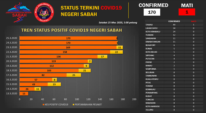 Tiada sebarang tambahan kes positif COVID-19 bagi negeri Sabah dan ia kekal sebanyak 170 kes setakat Rabu.