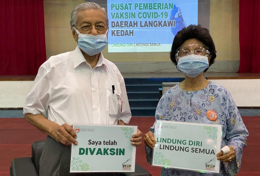 LANGKAWI: Bekas Perdana Menteri yang juga Ahli Parlimen Langkawi, Tun Dr Mahathir Mohamad bersama isteri, Tun Dr Siti Hasmah Mohamad Ali hari ini menerima suntikan vaksin COVID-19 jenis Pfizer-BioNTech.