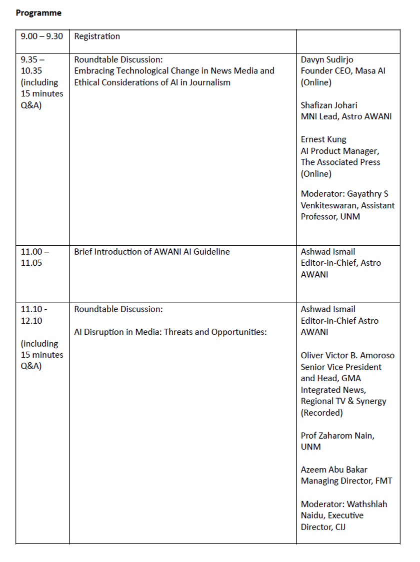 Perbincangan meja bulat ini bertujuan menyediakan platform kepada wartawan, organisasi media, akademik, masyarakat madani, dan agensi kerajaan untuk membincangkan implikasi AI terhadap kewartawanan dan masyarakat.