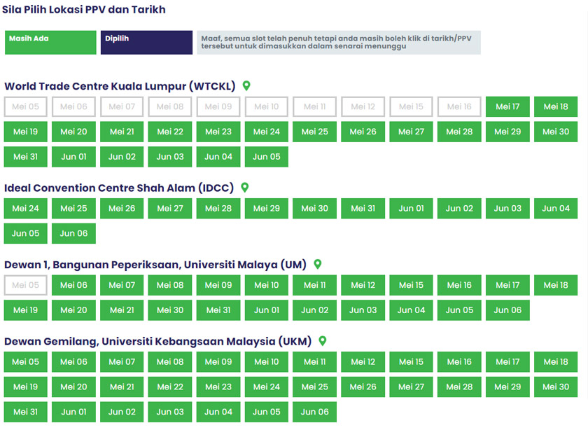 Sementara pilihan tarikh janji temu untuk Dewan 1 Bangunan Peperiksaan UM dan Dewan Gemilang UKM ialah antara 5 Mei hingga 6 Jun depan.