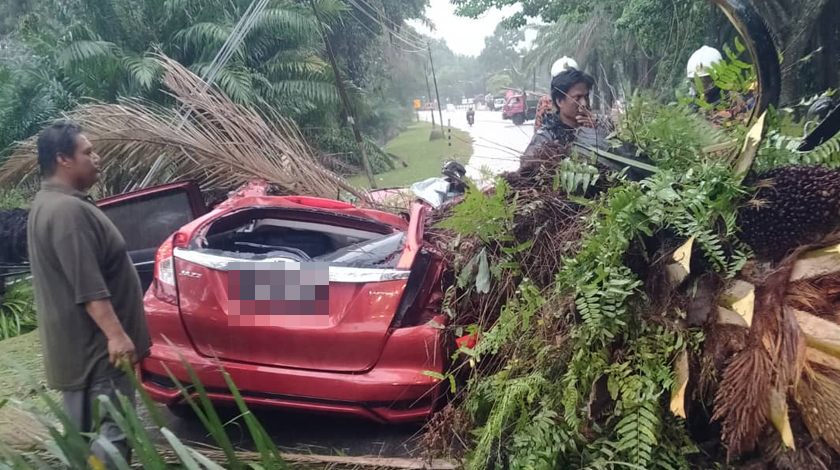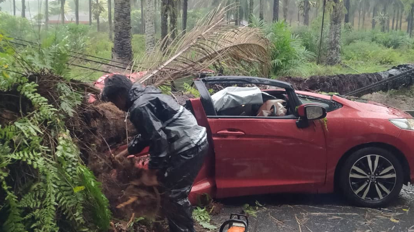 Sebaik tiba, pihaknya mendapati terdapat sebatang pokok kelapa sawit telah tumbang dan menghempap sebuah kereta jenis Honda Jazz, yang ketika itu melalui kawasan tersebut.