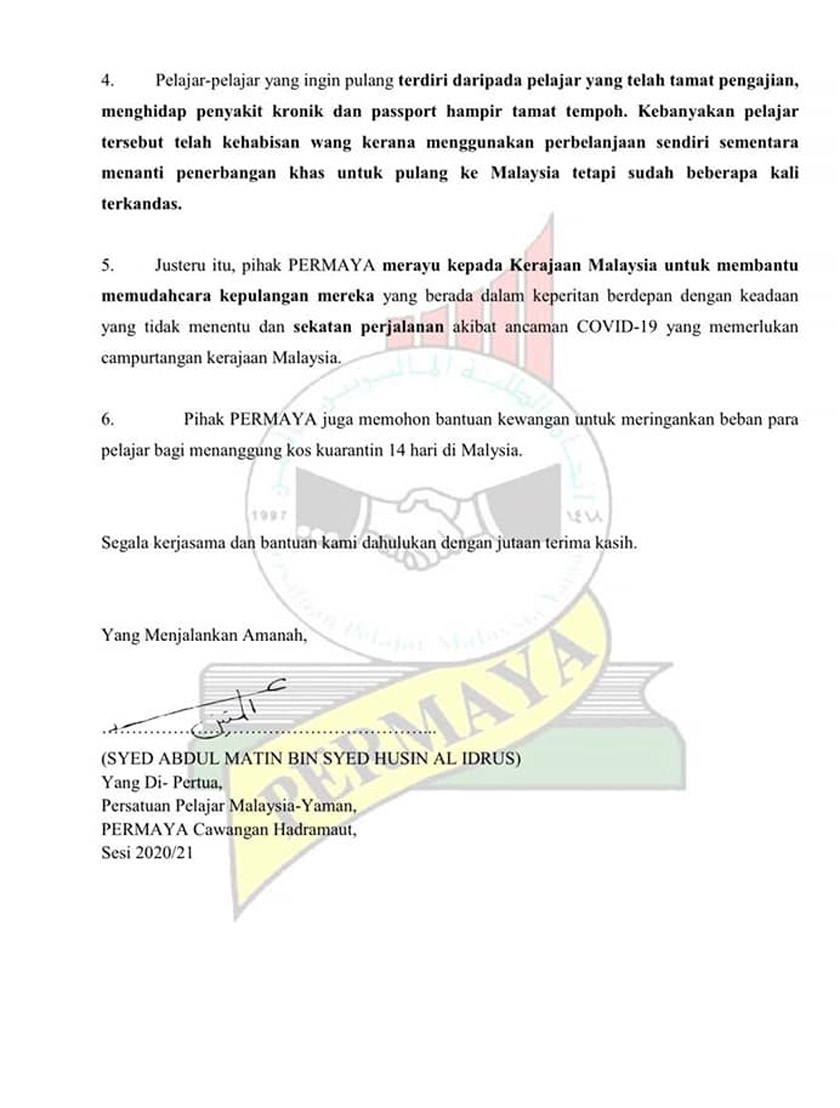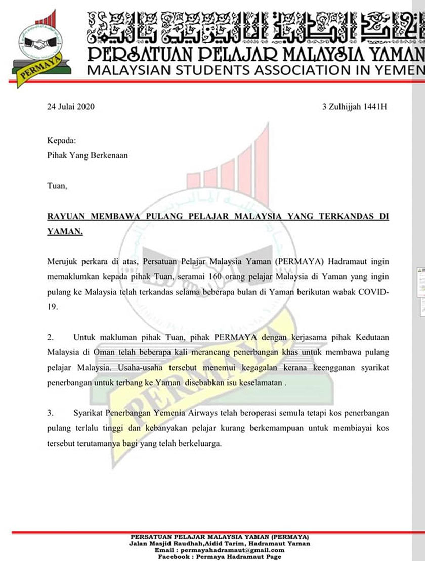 “Menerusi satu kenyataan yang saya terima daripada Persatuan Pelajar Malaysia Yaman (PERMAYA), mereka mendakwa 160 pelajar sudah beberapa bulan terkandas akibat wabak itu.