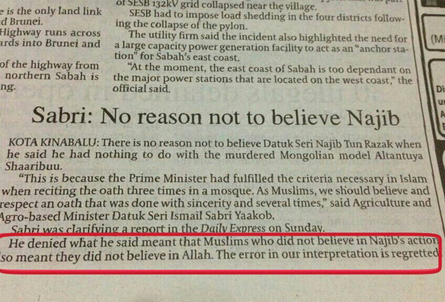 Keratan akhbar memohon maaf yang disiarkan Daily Express kerana tersalah tafsir kenyataan Ismail Sabri