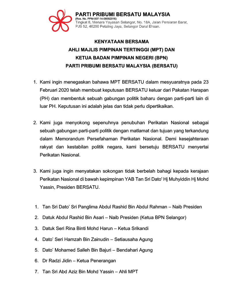 Ahli Majlis Pimpinan Tertinggi (MPT) Bersatu telah membuat keputusan untuk keluar daripada Pakatan Harapan (PH) dan membentuk sebuah gabungan politik baharu dengan parti-parti lain di luar gabungan itu pada satu mesyuarat 23 Februari lalu.
