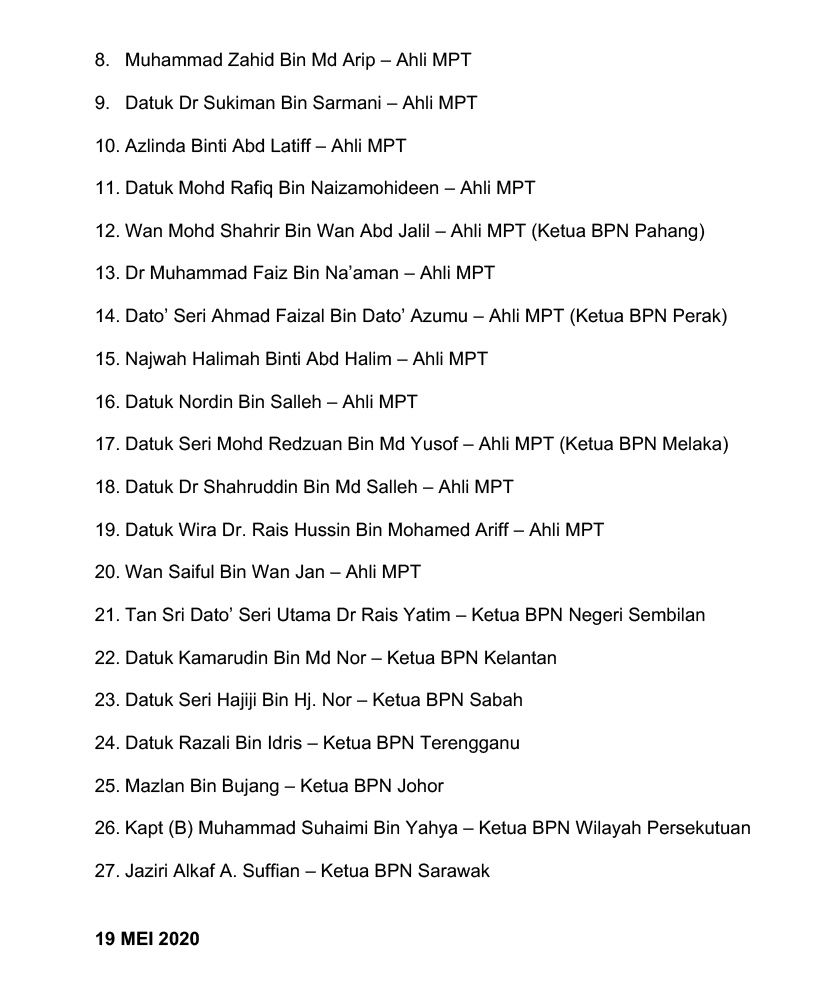 Kenyataan itu dikeluarkan oleh dua Naib Presiden Bersatu,Tan Sri Panglima Abdul Rashid Abdul Rahman dan Datuk Abdul Rashid Bin Asari; Ketua Srikandi, Datuk Seri Rina Mohd Harun; Setiausaha Agung Datuk Seri Hamzah Zainudin; Bendahari Agung Datuk Mohamed Salleh Bajuri; Ketua Penerangan, Dr Radzi Jidin, ahli-ahli MPT dan Ketua BPN.