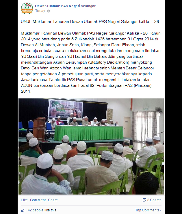 Menurut posting Facebook terbaru Dewan Ulamak PAS Negeri Selangor, usul itu juga akan diserahkan kepada Jawatankuasa Tatatertib PAS Pusat untuk diambil tindakan berdasarkan Fasal 82, Perlembagaan PAS (Pindaan) 2011.