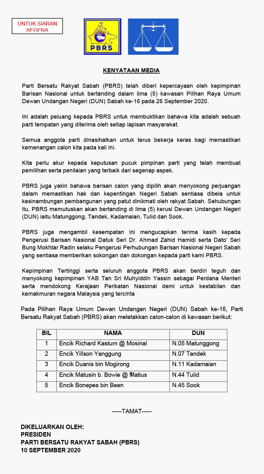 Parti Bersatu Rakyat Sabah (PBRS) mengumumkan bertanding lima kerusi pada Pilihan Raya Negeri (PRN) Sabah ke-16.