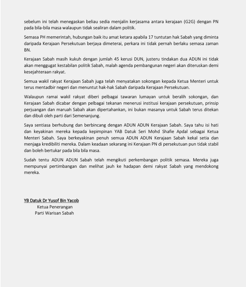"Semua wakil rakyat Kerajaan Sabah juga telah menyatakan sokongan kepada Ketua Menteri untuk terus mentadbir negeri dan menuntut hak-hak Sabah daripada Kerajaan Persekutuan.